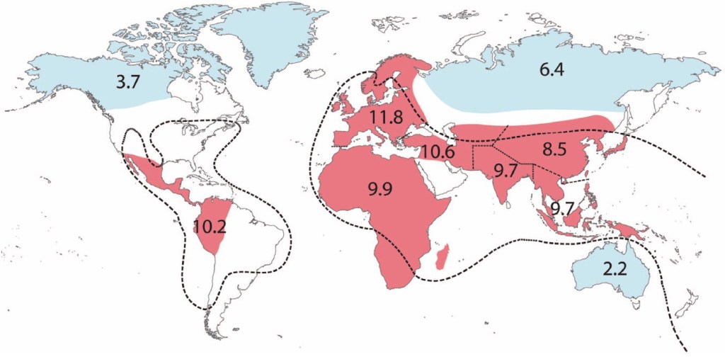You can see from the map below, on which the dash lines mark the approximate extension of prehistoric agriculture, that from the ancestral number of copies of the gene (two) in wolves and other related carnivores, the number of copies increased as much as 11 fold (to 22 in both the Tazi and the New Guinea Singing dog) in dogs from agrarian regions. This held not just for the “breed” dogs, but also for the native village dogs in those areas. The dogs with the fewest copies of the AMY2B gene were from areas where the climate was not suitable for large-scale agriculture, and fish and meat likely formed a greater proportion of the diet (e.g., Greenland dog, Siberian Husky):
