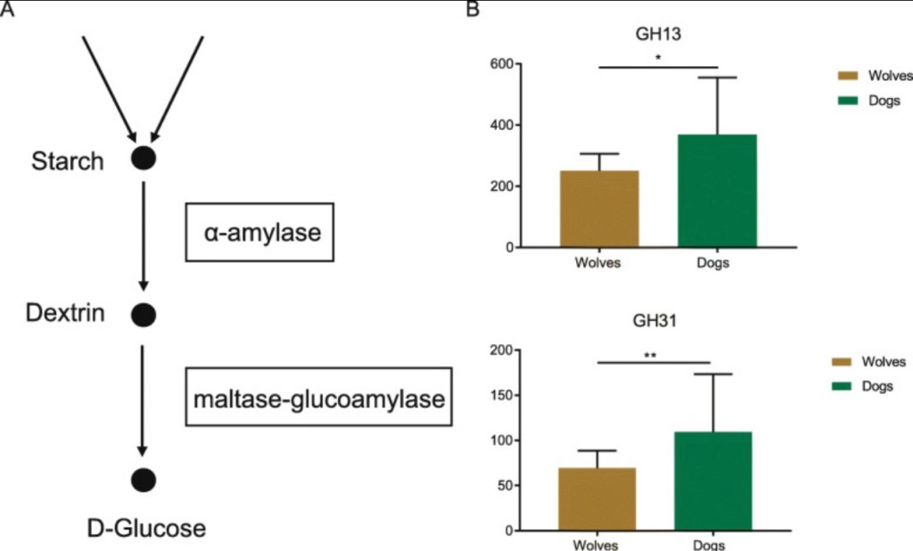 There is a fantastic study, A key genetic innovation in dogs: diet, which was done on the genetic changes and evolutionary diversion that domestic canines have undergone and how that affects their diet and digestion — specifically their genetic coding for the production of pancreatic amylase (AMY2B), which breaks down starch into the sugar maltose in the small intestine.