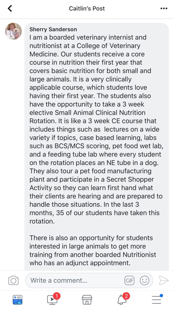 As an LVT in the state of Tennessee, I have both an Associate’s and a Bachelor’s degree. I received an entire semester course on nutrition during my initial Associate’s degree, and 3 additional courses during my remaining Bachelor’s classes. Every year I take numerous CE courses at RACE-approved conferences around the country.